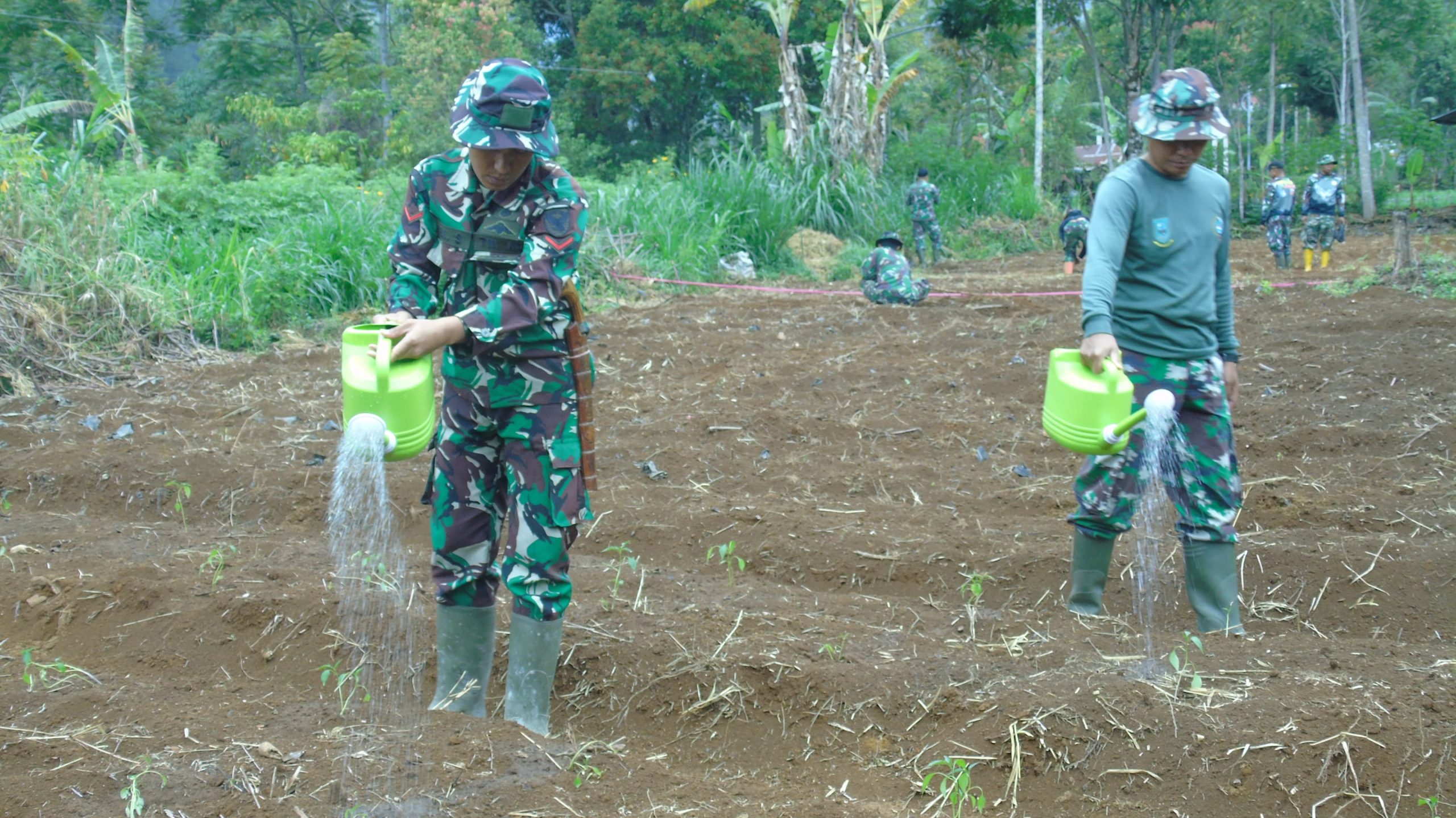 Sungai Penuh – Anggota Satgas TNI Manunggal Membangun Desa (TMMD) turun ke lahan pertanian Desa Sungai Jernih untuk menyirami lahan serta menanam bibit cabe dilahan pertanian Warga setempat untuk program Hanpangan dalam TMMD 126 Kodim 0417/Kerinci. Pada Kamis 23/10/2025