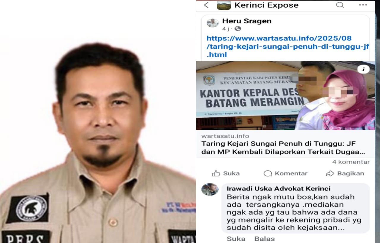 Melalui akun Facebook pribadinya, @Irawadi Uska Advokat Kerinci, ia menanggapi sebuah pemberitaan Warta Satu yang diunggah di grup Kerinci Expose dengan judul “Taring Kejari Sungai Penuh Ditunggu: JF dan MP Kembali Dilaporkan Terkait Dugaan Korupsi DD Batang Merangin”.