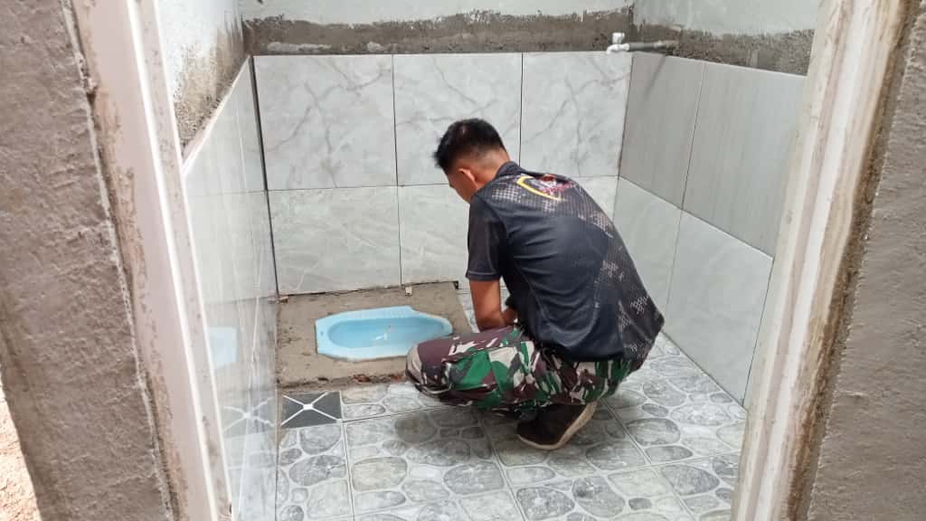 Pemasangan keramik dilakukan dengan penuh ketelitian oleh Koptu Edward. Dengan keahlian dan ketelatenannya, keramik dipasang secara presisi guna memastikan kualitas dan ketahanan fasilitas MCK yang dibangun untuk warga.